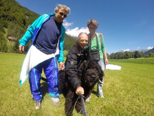 28. August 2014 Mein Chef mach heute einen Gleitschirmflug. Ich weiss von all dem nichts. Aber ich darf ihn beim Landeplatz begrüssen! Da freut er sich bestimmt.